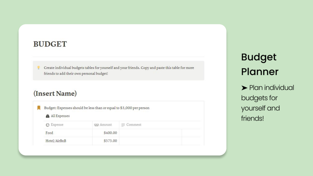 Effortlessly collaborate with your friends to plan your next trip! Share this template with your friends to manage budget, flights, accommodations, and create the perfect itinerary with all your desired attractions. This simple layout ensures that you and your friends will see all vacation essentials in a concise manner. Customize this template to fit your taste and needs. Plan your vacation easily and enjoy a stress free trip!
