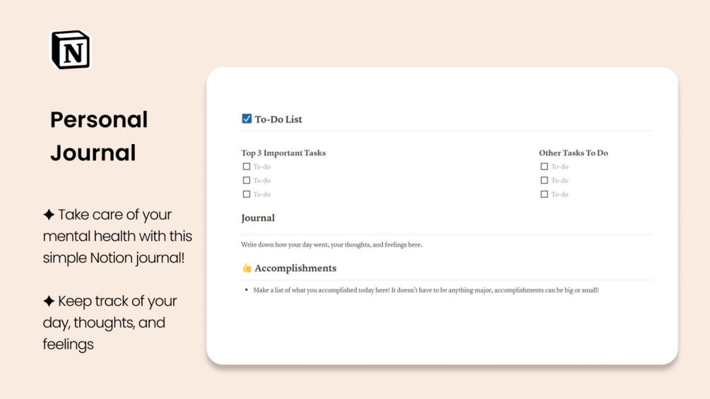 Use this simple Notion journal to track your day and take care of your mental health. Record your tasks, feelings, physical health, goals and accomplishment easily with this journal. Write down how your day was, whether it was good or bad, and enhance your self reflection!